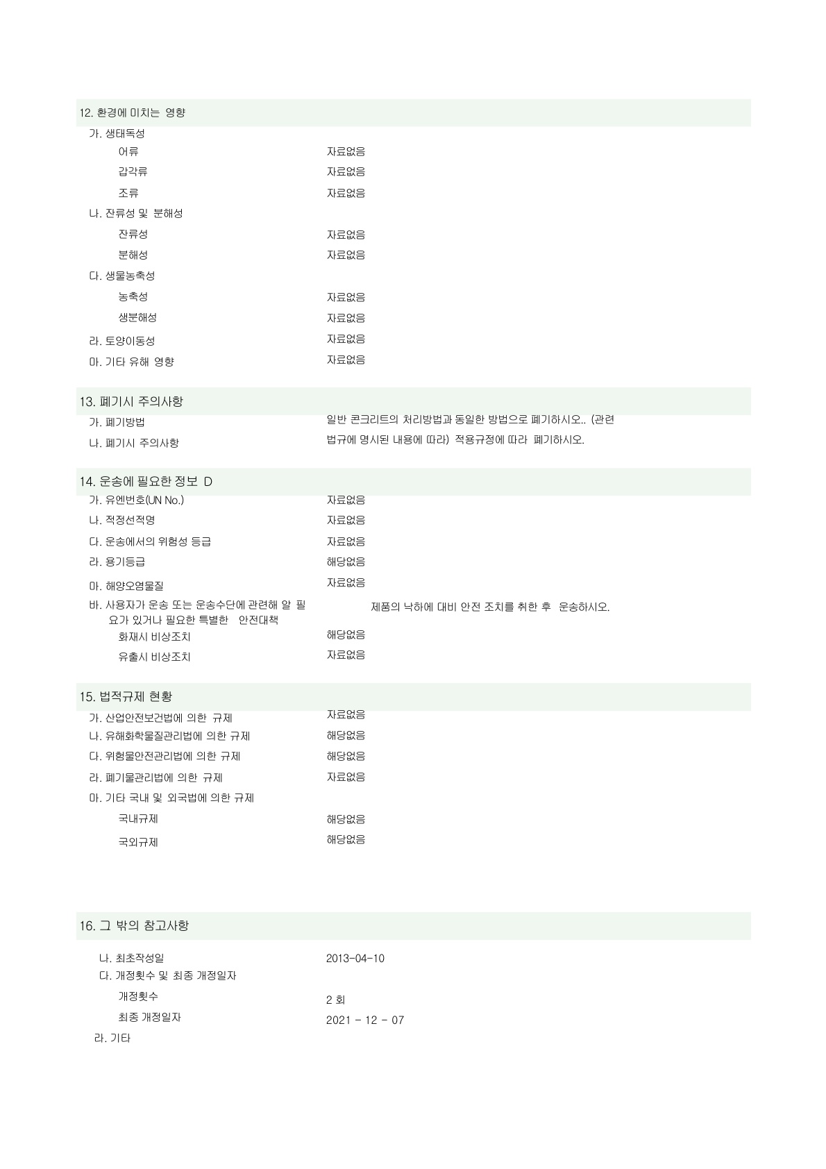 ALC몰탈(조적용,미장용) 물가안전보건자료 (MSDS)